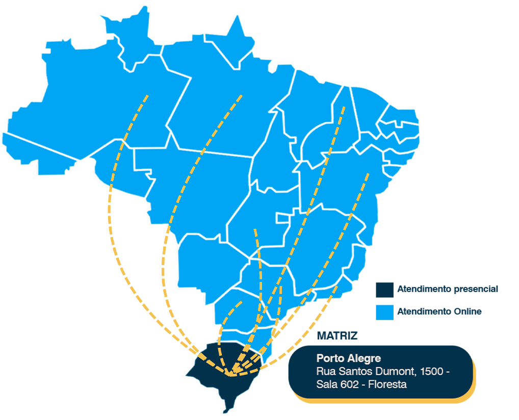 Com base no Sul do Brasil, atendemos clientes em todo o país com o mesmo padrão de qualidade do atendimento na nossa sede, presencialmente quando necessário e, na maioria dos casos, de forma 100% digital.